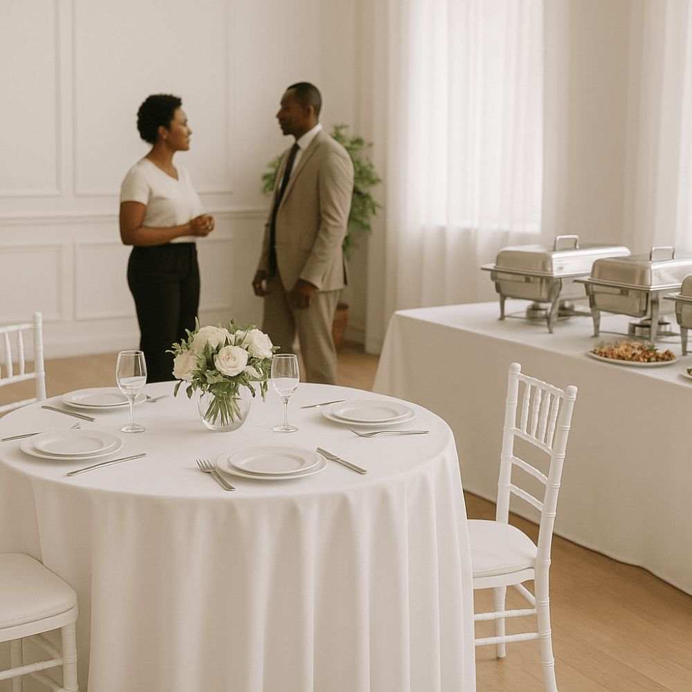Tables, chaises, nappes, vaisselle, décorations, tentes, éclairage…